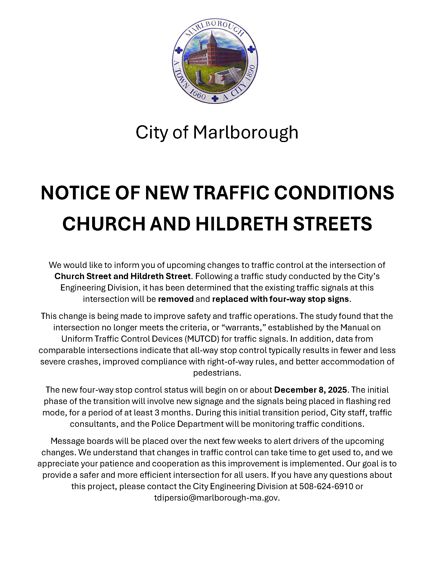 Notice of upcoming changes to the traffic control at the intersection of Church Street and Hildreth Street beginning on or about December 8, 2025.